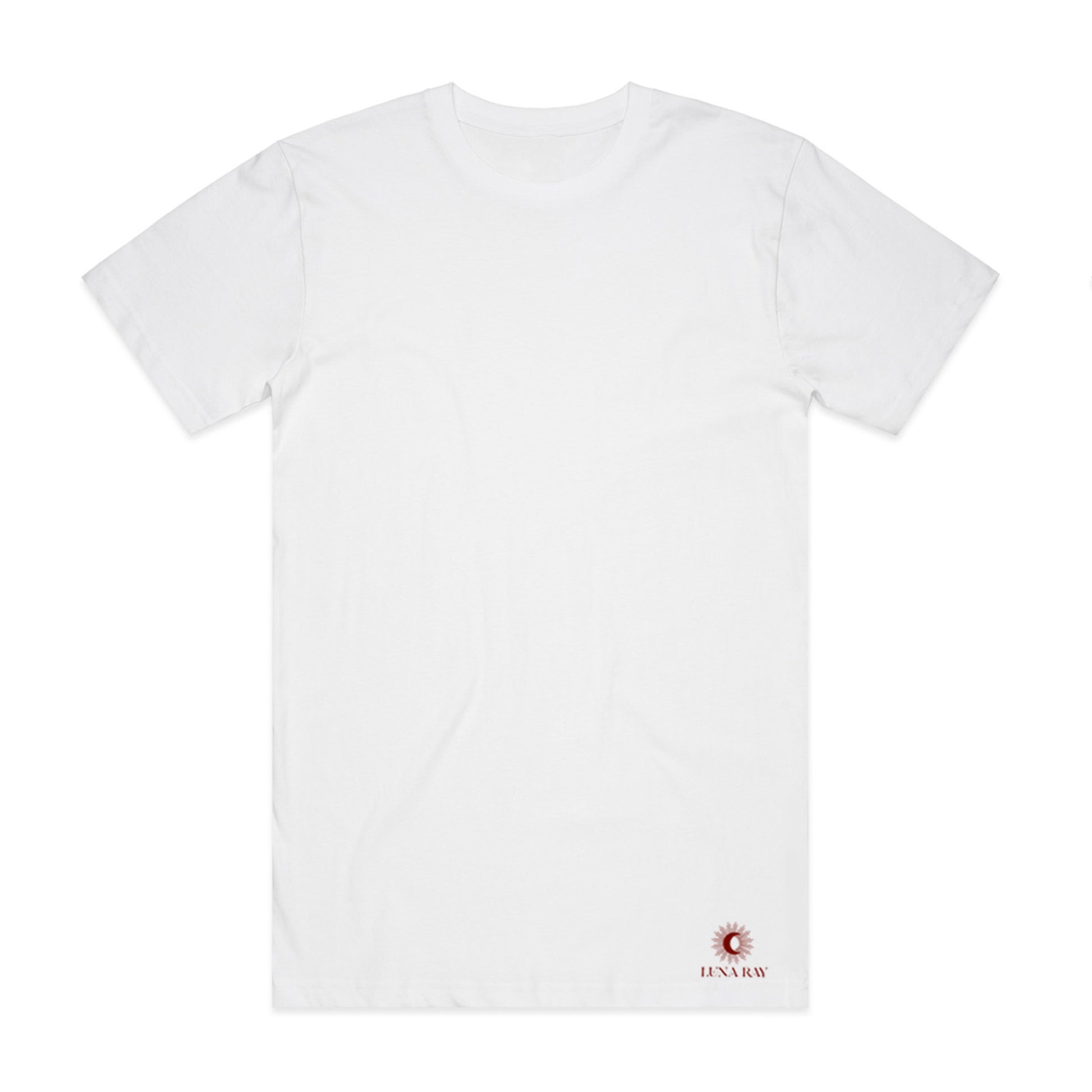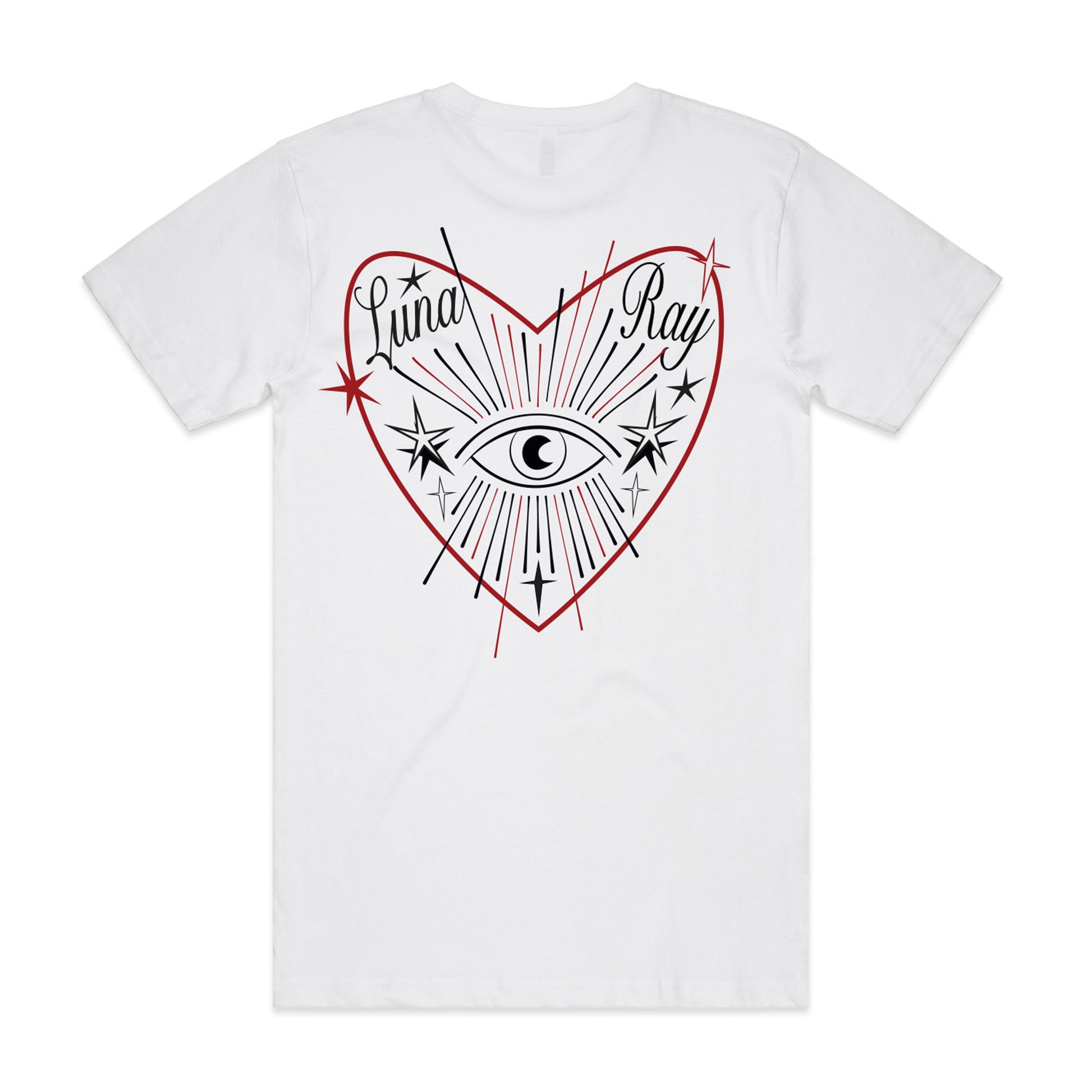 Featuring our Luna Heart design printed on the back - a radiating heart outline in red, framing an all-seeing eye, along with a subtle Luna Ray logo printed on the back in the bottom right corner.